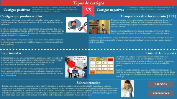 Benavides, J., & Miranda, S. (2007). Actitud crítica hacia el castigo físico en niños victimas de maltrato infantil. Universitas Psychologica, 6(2), 309–318. http://www.redalyc.org/articulo.oa?id=64760210 Centers for Disease Control and Prevention (CDC). (2017). Uso de tiempo fuera. YouTube. https://www.youtube.com/watch?v=8WeLyVA5kFU&ab_channel=CentersforDiseaseControlandPrevention%28CDC%29 Mazadiego Infante, T. de J. (2005). Detección de maltrato infantil en una muestra de escuelas primarias. Enseñanza e Investigación En Psicología, 10(2), 281–293. https://www.redalyc.org/pdf/292/29210205.pdf Palacios-Espinoza, X., Pulido, S., & Montaña, J. (2009). Estrategias desarrolladas por los niños para afrontar el castigo : un dialogo entre la psicología y la teoría de redes sociales. Universitas Psychologica, 8(2), 471–486. http://www.redalyc.org/articulo.oa?id=64712165015 Roldán, G., & García, O. (n.d.). L7. ¿Aún es debido castigar para modificar el comportamiento? Universidad Virtual del Estado de Guanajuato. https://avalicmod19c.uveg.edu.mx/mod/scorm/player.php?a=4988¤torg=MC_U2_L7_ORG&scoid=10718 Roldán, G., & García, O. (2022). ¿Se logra disminuir la frecuencia o desaparecer una conducta? YouTube. https://www.youtube.com/watch?v=L9rZ_M2-0yE&ab_channel=UVEGAcadémico Sauceda-García, J. M., Olivo-Gutierrez, N., Gutierrez, J., & Maldonado-Durán, M. (2006). El castigo físico en la crianza de los hijos. Boletín Médico Hospital Infantil de México.