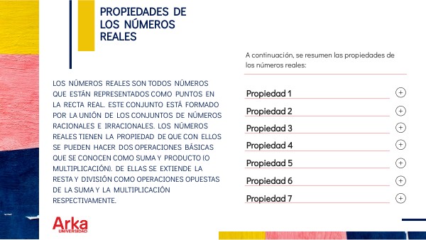 Los números reales son todos números que están representados como puntos en la recta real. Este conjunto está formado por la unión de los conjuntos de números racionales e irracionales. Los números reales tienen la propiedad de que con ellos se pueden hacer dos operaciones básicas que se conocen como suma y producto (o multiplicación). De ellas se extiende la resta y división como operaciones opuestas de la suma y la multiplicación respectivamente.