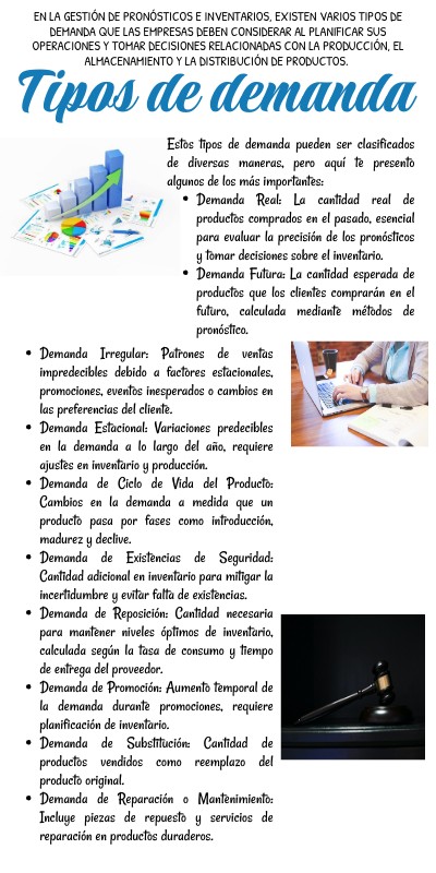En la gestión de pronósticos e inventarios, existen varios tipos de demanda que las empresas deben considerar al planificar sus operaciones y tomar decisiones relacionadas con la producción, el almacenamiento y la distribución de productos.