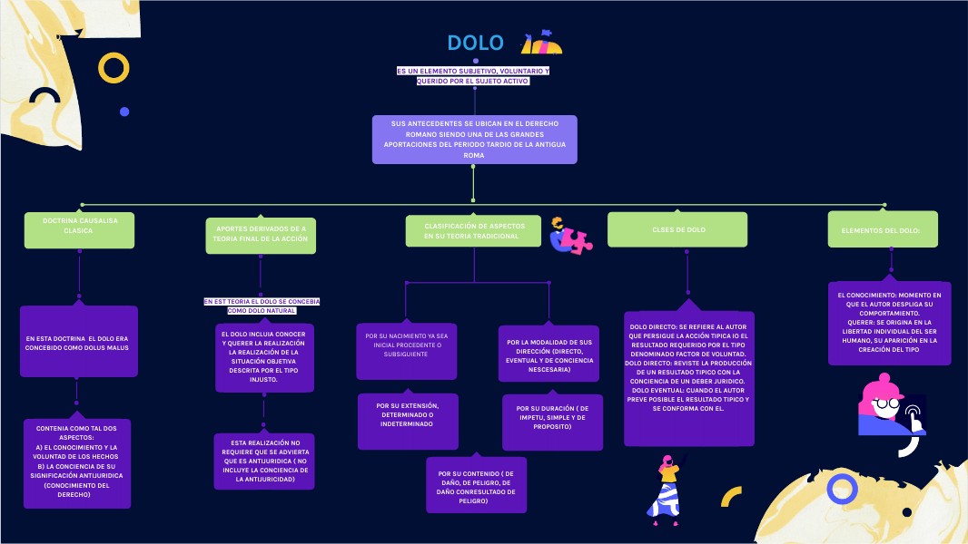 dolo directo: se refiere al autor que persigue la acción tipica io el resultado requerido por el tipo denominado factor de voluntad.dolo directo: reviste la producción de un resultado tipico con la conciencia de un deber juridico. dolo eventual: cuando el autor preve posible el resultado tipico y se conforma con el.