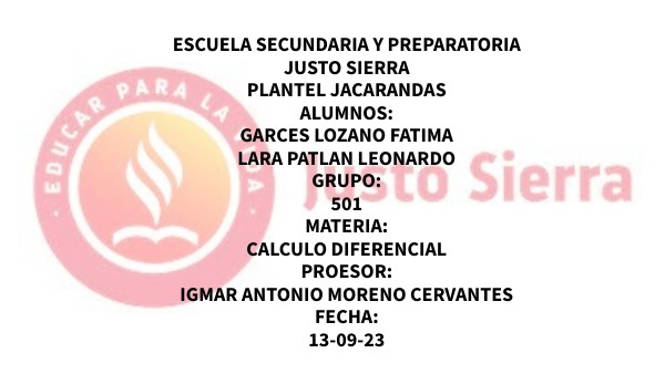 ESCUELA SECUNDARIA Y PREPARATORIA JUSTO SIERRA PLANTEL JACARANDAS ALUMNOS: GARCES LOZANO FATIMA LARA PATLAN LEONARDO GRUPO: 501 MATERIA: CALCULO DIFERENCIAL PROESOR: IGMAR ANTONIO MORENO CERVANTES FECHA: 13-09-23