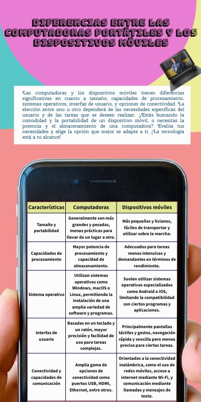 Las computadoras y los dispositivos móviles tienen diferencias significativas en cuanto a tamaño, capacidades de procesamiento, sistemas operativos, interfaz de usuario, y opciones de conectividad. La elección entre uno u otro dependerá de las necesidades específicas del usuario y de las tareas que se deseen realizar. ¿Estás buscando la comodidad y la portabilidad de un dispositivo móvil, o necesitas la potencia y el almacenamiento de una computadora? Evalúa tus necesidades y elige la opción que mejor se adapte a ti. ¡La tecnología está a tu alcance!