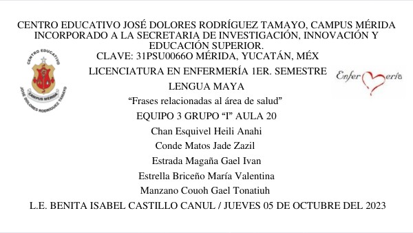 CENTRO EDUCATIVO JOSÉ DOLORES RODRÍGUEZ TAMAYO, CAMPUS MÉRIDA INCORPORADO A LA SECRETARIA DE INVESTIGACIÓN, INNOVACIÓN Y EDUCACIÓN SUPERIOR. CLAVE: 31PSU0066O MÉRIDA, YUCATÁN, MÉX LICENCIATURA EN ENFERMERÍA 1ER. SEMESTRE LENGUA MAYA “Frases relacionadas al área de salud” EQUIPO 3 GRUPO “I” AULA 20 Chan Esquivel Heili Anahi Conde Matos Jade Zazil Estrada Magaña Gael Ivan Estrella Briceño María Valentina Manzano Couoh Gael Tonatiuh L.E. BENITA ISABEL CASTILLO CANUL / JUEVES 05 DE OCTUBRE DEL 2023