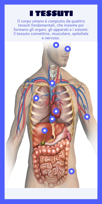 Il corpo umano è composto da quattro tessuti fondamentali, che insieme poi formano gli organi, gli apparati e i sistemi: il tessuto connettivo, muscolare, epiteliale e nervoso.