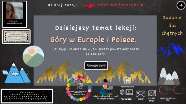 Krótkie wprowadzenie do tematu przez nauczyciela lub obejrzenie filmiku - do wyboru dla ucznia:). 1. Po czym poznasz góry? - burza mózgów. Bajka. 2. Jak powstają góry? Podział gór. GOOGLE EARTH. 3. Góry fałdowe w Europie. Góry fałdowe w Polsce (masło orzechowe i ciastka oraz ręczniki). 4. Góry zrębowe w Europie. Góry zrębowe w Polsce (gąbka w paski). 5. Góry wulkaniczne w Europie i Polsce (zlewka + folia aliminiowa soda i ocet, płyn do mycia naczyń). 6. Podsumowanie - quizizz.