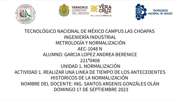 TECNOLÓGICO NACIONAL DE MÉXICO CAMPUS LAS CHOAPAS INGENIERÍA INDUSTRIAL Metrología y Normalización AEC-1048 N ALUMNO: GARCIA LOPEZ ANDREA BERENICE 221ª0408 UNIDAD 1. NORMALIZACIÓN ACTIVIDAD 1. REALIZAR UNA LINEA DE TIEMPO DE LOS ANTECEDENTES HISTORICOS DE LA NORMALIZACIÓN NOMBRE DEL DOCENTE: ING. SANTOS ARGENIS GONZÁLES OLÁN DOMINGO 17 DE SEPTIEMBRE 2023