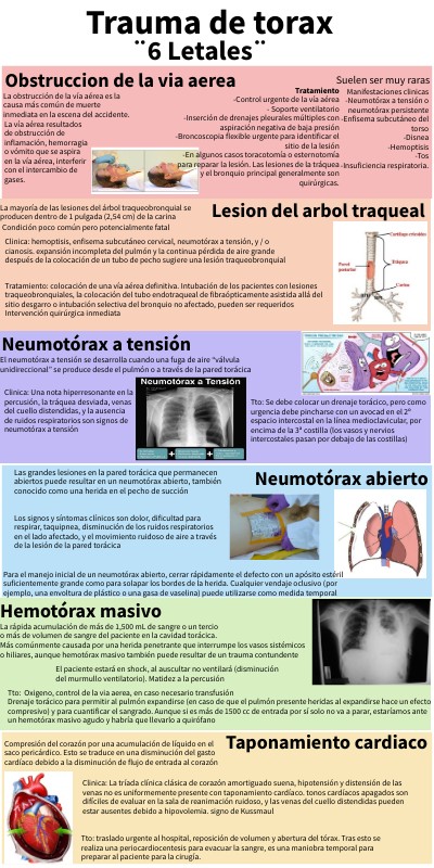 Clinica: Una nota hiperresonante en la percusión, la tráquea desviada, venas del cuello distendidas, y la ausencia de ruidos respiratorios son signos de neumotórax a tensión