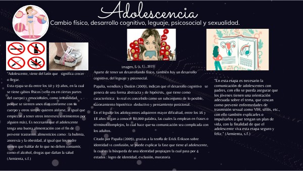 "Adolescente, viene del latín que significa crecer o llegar.Esta etapa se da entre los 10 y 19 años, en la cual se tiene cabios físicos (vello en en ciertas partes del cuerpo) y emocionales, como irritabilidad, porque se sienten unos días conforme con su cuerpo y otros simple quieren aislarse, al igual que empiezan a tener otros intereses(sentimientos por alguien más), Es necesario que el adolescente tenga una buena alimentación con el fin de prevenir trastornos alimenticios como : la bulimia, anorexia y la obesidad, al igual que los padre tienen que hablar de lo que no deben consumir, como el alcohol, drogas que dañan la salud (Armienta, s.f.)