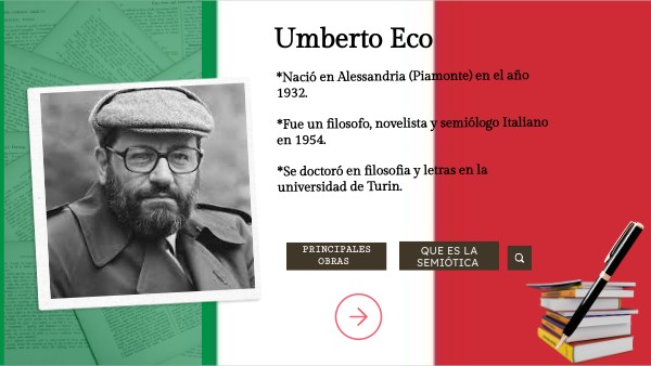 *Nació en Alessandria (Piamonte) en el año 1932. *Fue un filosofo, novelista y semiólogo Italiano en 1954. *Se doctoró en filosofia y letras en la universidad de Turin.