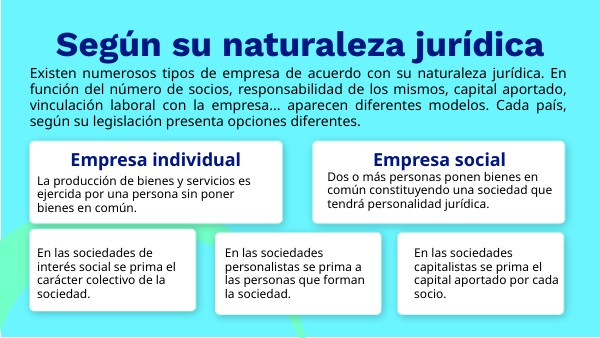 Existen numerosos tipos de empresa de acuerdo con su naturaleza jurídica. En función del número de socios, responsabilidad de los mismos, capital aportado, vinculación laboral con la empresa... aparecen diferentes modelos. Cada país, según su legislación presenta opciones diferentes.