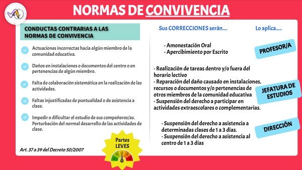 - Aula de Convivencia, Mediación, Trabajo en habilidades sociales. - Realización de tareas fuera del horario lectivo. - Reparación del daño causado en instalaciones, recursos o documentos y/o pertenencias de otros miembros de la comunidad educativa - Suspensión del derecho a participar en actividades extraescolares o complementarias. - Cambio de grupo. - Cambio de centro. - Suspensión del derecho a asistencia a determinadas clases de 3 a 14 días. - Suspensión del derecho a asistencia al centro de 4 a 30 días.