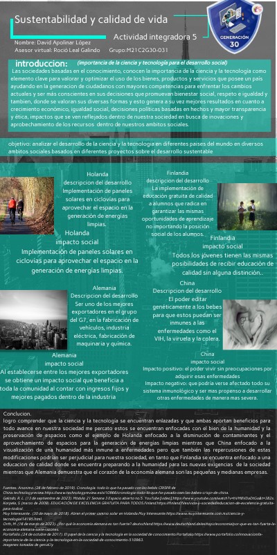 Fuentes: Anonimo. (26 de febrero de 2019). Cronología: todo lo que ha pasado con las bebés CRISPR de China.technologyreview.https://www.technologyreview.es/s/10966/cronologia-todo-lo-que-ha-pasado-con-las-bebes-crispr-de-china.Galindo, R. L. (13 de septiembre de 2023). Módulo 21 Semana 3 Espacio abierto no.5. YouTube [video].https://www.youtube.com/watch?v=hVM8VDaDtGo&t=382s. Korpela, S. (marzo de 2009). EDUCACIÓN DE EXCELENCIA GRATUITA PARA TODOS.Finland.https://finland.fi/es/vida-y-sociedad/educacion-de-excelencia-gratuita-para-todos/. Muy Interesante . (30 de mayo de 2018). Abren el primer camino solar en Holanda.Muy Interesante.https://www.muyinteresante.com.mx/ciencia-y-tecnologia/14195.html. Orth, M. (16 de marzo de 2023). ¿Por qué la economía alemana es tan fuerte?.deutschland.https://www.deutschland.de/es/topic/economia/por-que-es-tan-fuerte-la-economia-alemana-siete-razones. Portafolio. (24 de octubre de 2017). El papel de la ciencia y la tecnología en la sociedad de conocimiento.Portafolio.https://www.portafolio.co/innovacion/la-importancia-de-la-ciencia-y-la-tecnologia-en-la-sociedad-de-conocimiento-510963. imagenes tomadas de genial.ly