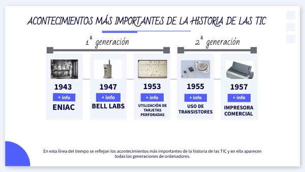 En esta línea del tiempo se reflejan los acontecimientos más importantes de la historia de las TIC y en ella aparecen todas las generaciones de ordenadores.