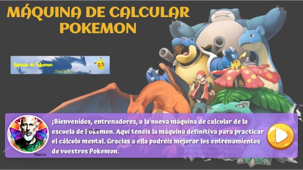 ¡Bienvenidos, entrenadores, a la nueva máquina de calcular de la escuela de Pokemon. Aquí tenéis la máquina definitiva para practicar el cálculo mental. Gracias a ella podréis mejorar los entrenamientos de vuestros Pokemon.