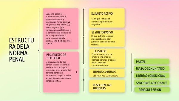 La norma penal se estructura mediante el presupuesto penal y funciona en forma positiva (el que manda u ordena), y forma negativa (que contiene una prohibicion) y la consecuencia juridica es decir, la punibilidad, la pena o consecuencia juridica. está dirigida a tres sujetos