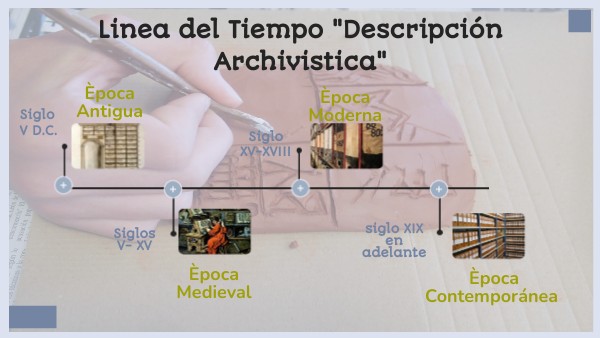 • Siglo XIX: Se formalizan principios archivísticos como el respeto al fondo y al orden original.• Siglo XX: Se crean normas internacionales (ISAD(G), ICA) para la descripción archivística. Surge el concepto de acceso ciudadano a la información.• Era digital: La descripción se adapta a sistemas electrónicos, metadatos y gestión documental digital. Se promueve la interoperabilidad y el acceso global.