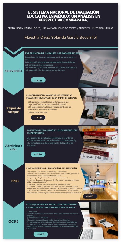 Bibliografía. Miranda, F., Islas, J. y Fuentes, A. (2017). El sistema nacional de evaluación educativa en México: un análisis en perspectiva comparada. Congreso Nacional de Investigación Educativa. San Luis Potosí, México. Cordero, A., Luna, E., Patiño, A. y Xochilth, N. (2013). La evaluación docente en educación básica en México: panorama y agenda pendiente. Revista Electrónica Sinéctica, (41), 1-19.