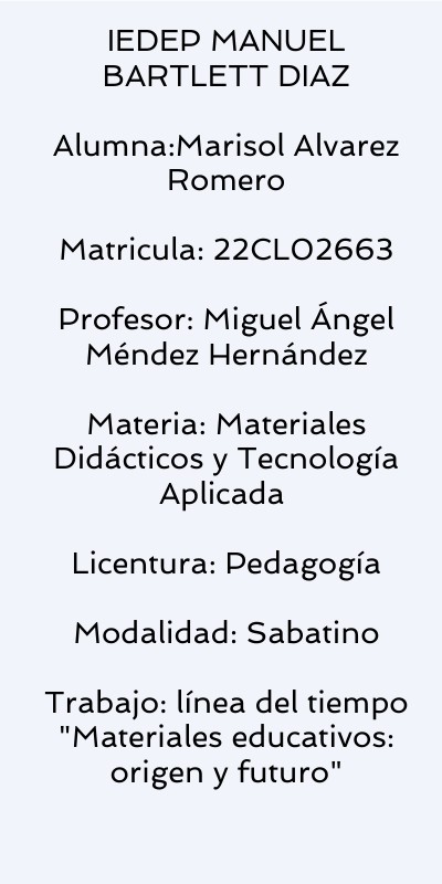 IEDEP MANUEL BARTLETT DIAZAlumna:Marisol Alvarez Romero Matricula: 22CL02663 Profesor: Miguel Ángel Méndez Hernández Materia: Materiales Didácticos y Tecnología Aplicada Licentura: Pedagogía Modalidad: Sabatino Trabajo: línea del tiempo "Materiales educativos: origen y futuro"