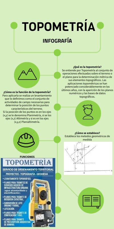 ¿Cómo es la función de la topometría? Para aplicarla se realiza un levantamiento que lo definimos como el conjunto de actividades de campo necesarias para determinar la posición de los puntos característicos del terreno. Si la posición de los puntos es en los ejes (x,y) se le denomina Planimetría, si se los ejes (x,z) Altimetría y si es en los ejes (x,y,z) Planialtimetría.