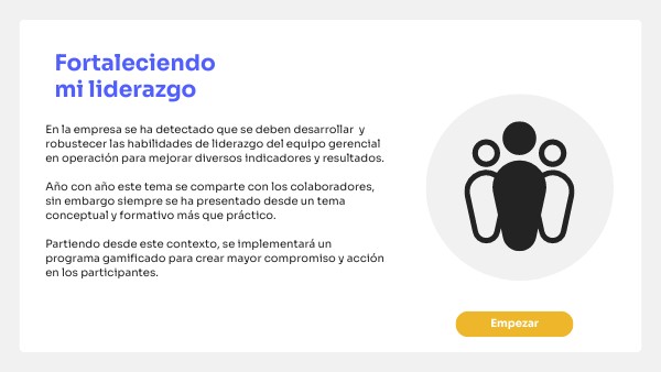 En la empresa se ha detectado que se deben desarrollar y robustecer las habilidades de liderazgo del equipo gerencial en operación para mejorar diversos indicadores y resultados. Año con año este tema se comparte con los colaboradores, sin embargo siempre se ha presentado desde un tema conceptual y formativo más que práctico. Partiendo desde este contexto, se implementará un programa gamificado para crear mayor compromiso y acción en los participantes.