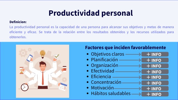 La productividad personal es un factor importante para el éxito en cualquier ámbito de la vida. Para mejorar nuestra productividad personal, es importante identificar los factores que inciden favorablemente y negativamente en ella, y tomar medidas para potenciar los primeros y minimizar los segundos.