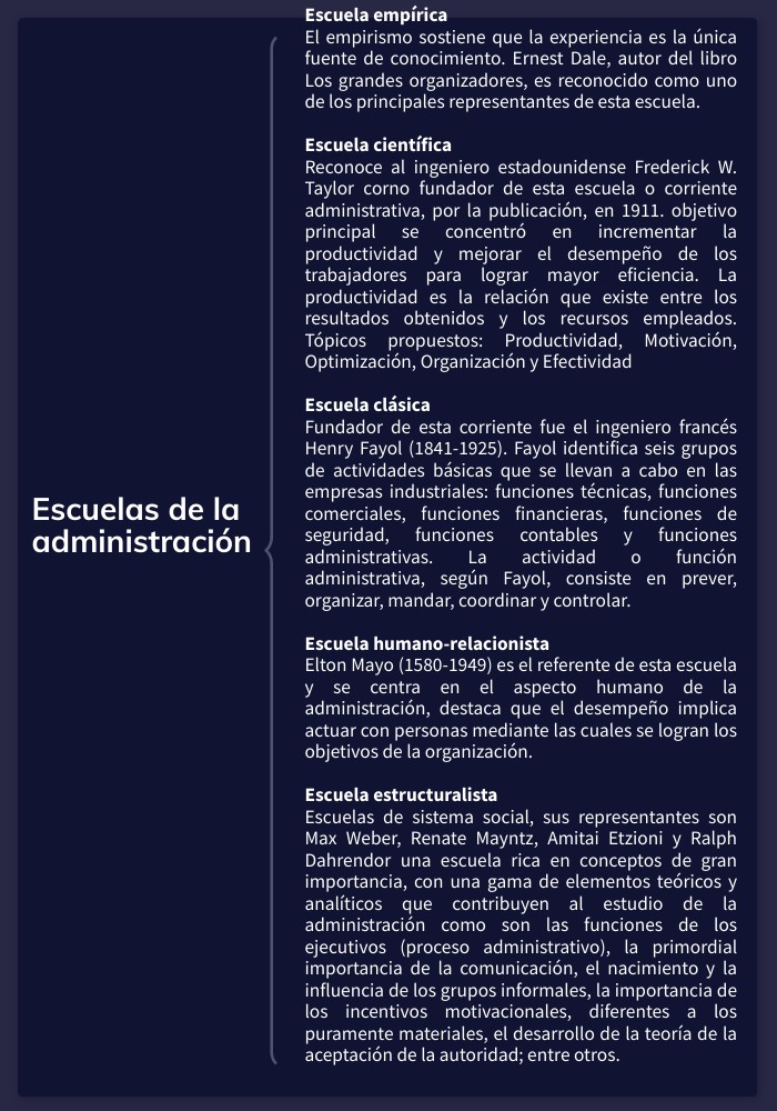 Escuela empírica El empirismo sostiene que la experiencia es la única fuente de conocimiento. Ernest Dale, autor del libro Los grandes organizadores, es reconocido como uno de los principales representantes de esta escuela. Escuela científica Reconoce al ingeniero estadounidense Frederick W. Taylor corno fundador de esta escuela o corriente administrativa, por la publicación, en 1911. objetivo principal se concentró en incrementar la productividad y mejorar el desempeño de los trabajadores para lograr mayor eficiencia. La productividad es la relación que existe entre los resultados obtenidos y los recursos empleados. Tópicos propuestos: Productividad, Motivación, Optimización, Organización y Efectividad Escuela clásica Fundador de esta corriente fue el ingeniero francés Henry Fayol (1841-1925). Fayol identifica seis grupos de actividades básicas que se llevan a cabo en las empresas industriales: funciones técnicas, funciones comerciales, funciones financieras, funciones de seguridad, funciones contables y funciones administrativas. La actividad o función administrativa, según Fayol, consiste en prever, organizar, mandar, coordinar y controlar. Escuela humano-relacionista Elton Mayo (1580-1949) es el referente de esta escuela y se centra en el aspecto humano de la administración, destaca que el desempeño implica actuar con personas mediante las cuales se logran los objetivos de la organización. Escuela estructuralista Escuelas de sistema social, sus representantes son Max Weber, Renate Mayntz, Amitai Etzioni y Ralph Dahrendor una escuela rica en conceptos de gran importancia, con una gama de elementos teóricos y analíticos que contribuyen al estudio de la administración como son las funciones de los ejecutivos (proceso administrativo), la primordial importancia de la comunicación, el nacimiento y la influencia de los grupos informales, la importancia de los incentivos motivacionales, diferentes a los puramente materiales, el desarrollo de la teoría de la aceptación de la autoridad; entre otros.