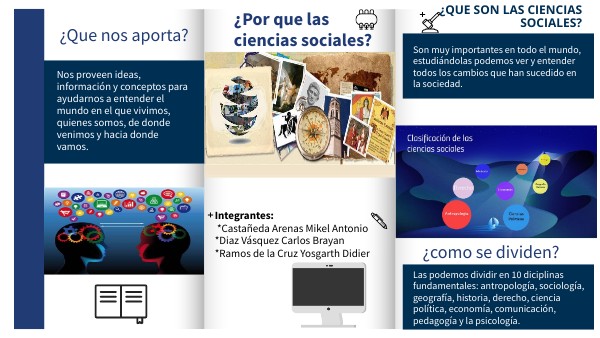 Las podemos dividir en 10 diciplinas fundamentales: antropología, sociología, geografía, historia, derecho, ciencia política, economía, comunicación, pedagogía y la psicología.