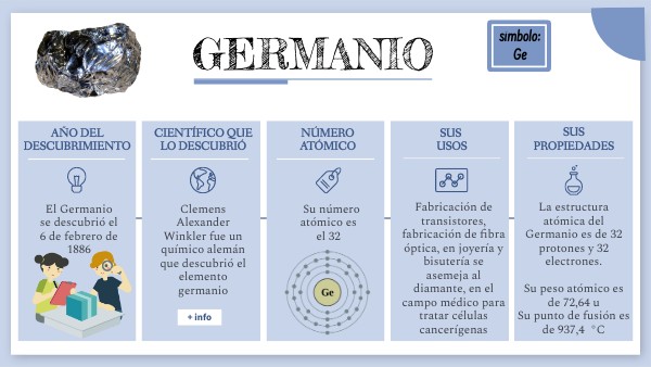 La estructura atómica del Germanio es de 32 protones y 32 electrones. Su peso atómico es de 72,64 u Su punto de fusión es de 937,4 °C