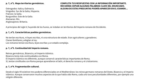 p. 7, nº1. Mapa territorios germánicos. COMPLETA TUS RESPUESTAS CON LA INFORMACIÓN IMPORTANTE. RECUERDA COPIAR ALGUNAS PALABRAS CLAVE DEL ENUNCIADO. Ostrogodos: Italia y Dalmacia. ALGUNA DE ESTAS PREGUNTAS PODRÍA APARECER EN EL EXAMEN... Visigodos: Sur de la Galia, Hispania. Francos: la Galia. Burgundios: Este de la Galia. Alamanes: Rin. Anglosajones: Britania. A principios del siglo V, huyendo de los hunos, se instalan en territorios del Imperio romano de Occidente. p. 7, nº2. Características pueblos germánicos. No tenían escritura, ni leyes escritas, ni una estructura de estado. Eran agricultores y ganaderos. Clanes familiares y elegían al rey. Los romanos tenían escritura, leyes escritas y un estado complejo. p. 7, nº3. Continuidad del Imperio romano. Reinos germánicos, Bizancio y el Imperio islámico. Bizancio tenía más continuidades con Roma. El Imperio islámico era diferente, aunque conservó características importantes de Roma. Sí, tenían similitudes con Roma porque aprendieron el latín, el derecho romano y el cristianismo. p. 7, nº4. Fragmentación cultural. Desde el siglo VII existiron tres poderes diferenciados en el Mediterráneo: los reinos germano-romanos del Oeste, Bizancio y el Imperio islámico. Aunque conservaron muchos aspectos de lo que había sido Roma, cada uno tuvo peculiaridades diferentes, por ejemplo una religión diferente.