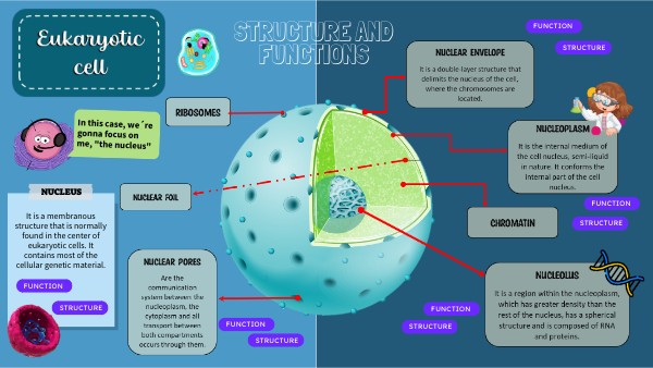 It is a membranous structure that is normally found in the center of eukaryotic cells. It contains most of the cellular genetic material.