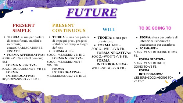 - TEORIA: si usa per parlare di eventi futuri, stabiliti o ricorrenti; come:ORARI,SCADENZE FISSATE;