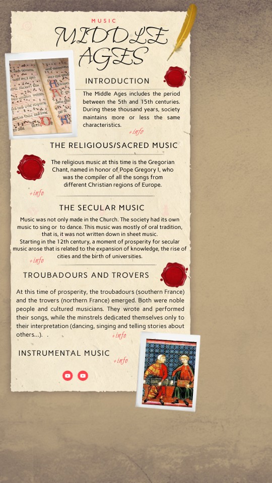 Music was not only made in the Church. The society had its own music to sing or to dance. This music was mostly of oral tradition, that is, it was not written down in sheet music.Starting in the 12th century, a moment of prosperity for secular music arose that is related to the expansion of knowledge, the rise of cities and the birth of universities.