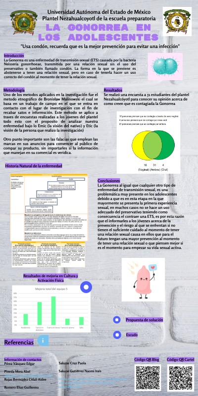 Conclusiones La Gonorrea al igual que cualquier otro tipo de enfermedad de transmisión sexual, es una problemática muy presente en los adolescentes debido a que es en esta etapa en la que mayormente se presenta la primera experiencia sexual, en muchos casos no se hace un uso adecuado del preservativo teniendo como consecuencia el contraer una ETS, es por esta razón que el informarles a los jóvenes acerca de la prevención y el riesgo al que se enfrentan si no tienen el suficiente cuidado al momento de tener una relación sexual causa en ellos que para el futuro tengan una mayor prevención al momento de tener una relación sexual o que piensen mejor si es el momento para empezar su vida sexual activa.