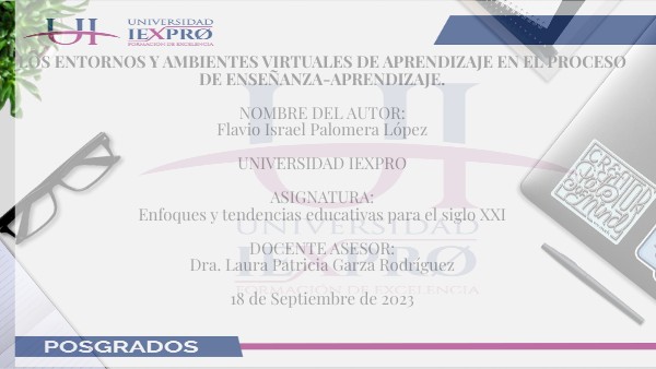 LOS ENTORNOS Y AMBIENTES VIRTUALES DE APRENDIZAJE EN EL PROCESO DE ENSEÑANZA-APRENDIZAJE. NOMBRE DEL AUTOR: Flavio Israel Palomera López UNIVERSIDAD IEXPRO ASIGNATURA: Enfoques y tendencias educativas para el siglo XXI DOCENTE ASESOR: Dra. Laura Patricia Garza Rodríguez 18 de Septiembre de 2023