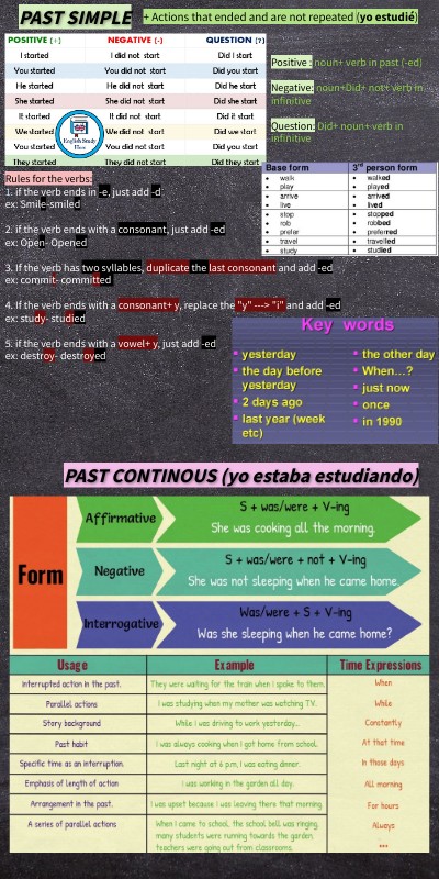 Rules for the verbs: 1. if the verb ends in -e, just add -d ex: Smile-smiled 2. if the verb ends with a consonant, just add -ed ex: Open- Opened 3. If the verb has two syllables, duplicate the last consonant and add -ed ex: commit- committed 4. If the verb ends with a consonant+ y, replace the "y" ---> "i" and add -ed ex: study- studied 5. if the verb ends with a vowel+ y, just add -ed ex: destroy- destroyed
