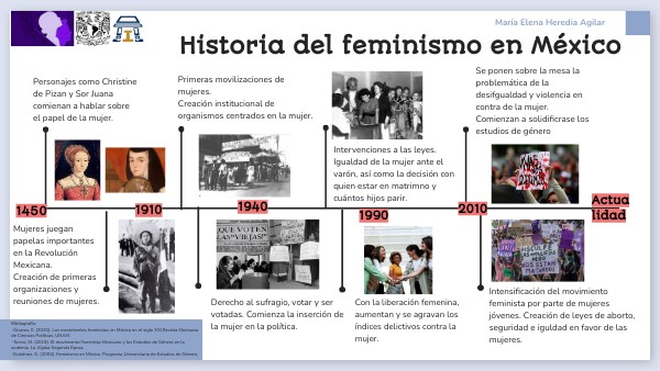 Bibliografía: -Álvarez, E. (2020). Los movimientos feministas en México en el siglo XXI.Revista Mexicana de Ciencias Políticas. UNAM. -Torres, M. (2019). El movimiento Feminista Mexicano y los Estudios de Género en la acdemia. La Aljaba Segunda Época. -Gutiérrez, G. (2002). Feminismo en México. Programa Universitario de Estudios de Género.