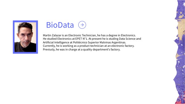Martin Zalazar is an Electronic Technician, he has a degree in Electronics. He studied Electronics at EPET N°1. At present he is studing Data Science and Artificial Intelligence at Politécnico Superior Malvinas Argentinas. Currently, he is working as a product technician at an electronic factory. Previusly, he was in charge at a quality department's factory.