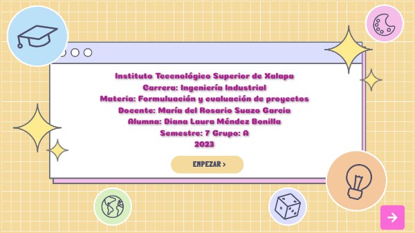 Instituto Teccnológico Superior de XalapaCarrera: Ingeniería Industrial Materia: Formuluación y evaluación de proyectos Docente: María del Rosario Suazo Garcia Alumna: Diana Laura Méndez Bonilla Semestre: 7 Grupo: A 2023