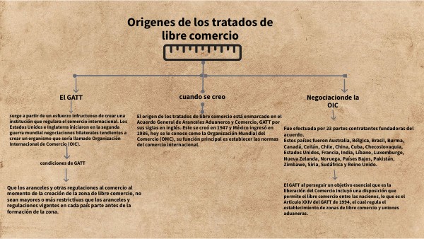 El origen de los tratados de libre comercio está enmarcado en el Acuerdo General de Aranceles Aduaneros y Comercio, GATT por sus siglas en inglés. Este se creó en 1947 y México ingresó en 1986, hoy se le conoce como la Organización Mundial del Comercio (OMC), su función principal es establecer las normas del comercio internacional.