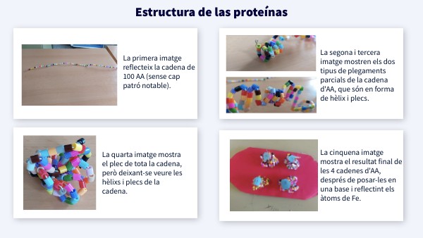 La segona i tercera imatge mostren els dos tipus de plegaments parcials de la cadena d'AA, que són en forma de hèlix i plecs.