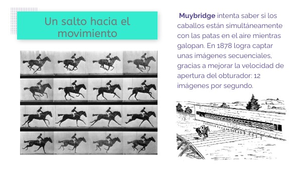 Muybridge intenta saber si los caballos están simultáneamente con las patas en el aire mientras galopan. En 1878 logra captar unas imágenes secuenciales, gracias a mejorar la velocidad de apertura del obturador: 12 imágenes por segundo.