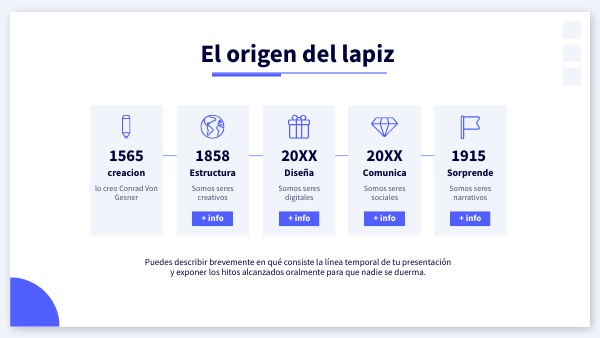 Puedes describir brevemente en qué consiste la línea temporal de tu presentación y exponer los hitos alcanzados oralmente para que nadie se duerma.
