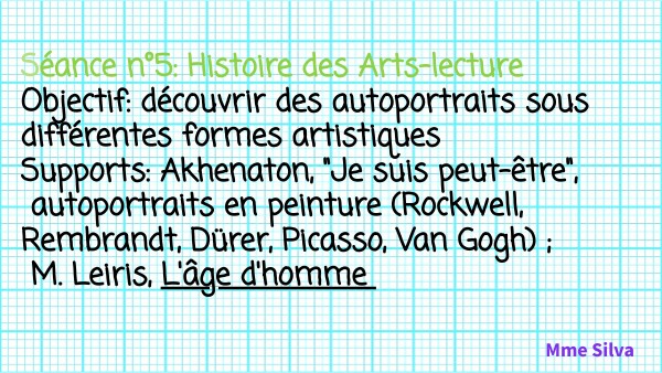 Séance n°5: Histoire des Arts-lecture Objectif: découvrir des autoportraits sous différentes formes artistiques Supports: Akhenaton, "Je suis peut-être", autoportraits en peinture (Rockwell, Rembrandt, Dürer, Picasso, Van Gogh) ; M. Leiris, L'âge d'homme