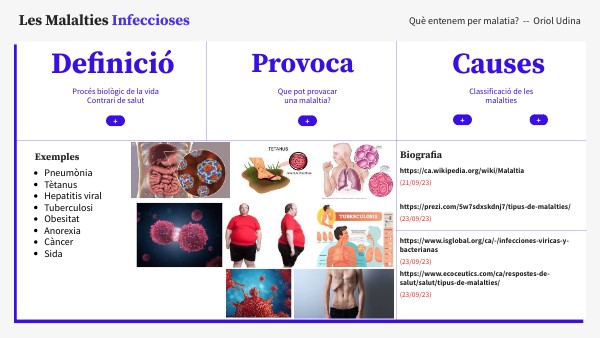 https://ca.wikipedia.org/wiki/Malaltia (21/09/23) https://prezi.com/5w7sdxskdnj7/tipus-de-malalties/ (23/09/23)