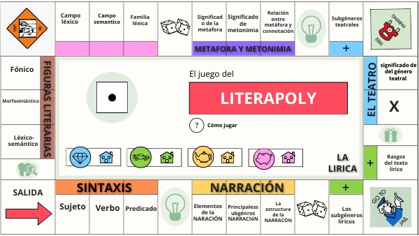 Cada jugador/a debe elegir un color: azul, verde, amarillo o rosa. Así obtiene una ficha para marcar su posición y 10 casas para indicar las propiedades que adquiere a lo largo del juego. Cada jugador debe coger la ficha de su color y colocarla en la casilla de salida. Para empezar a jugar, pincha sobre el dado y mueve tu ficha hasta la casilla que corresponda. En cada casilla debe haber una o varias preguntas. Si la aciertas, coloca una de tus casas en dicha casilla. ¡Enhorabuena, has conseguido una nueva propiedad! Casillas especiales: las casillas con iconos pueden contener sanciones como por ejemplo "El jugador paga impuestos de la luz: pierde 2 casas". ¡Acierta la pregunta para evitar la sanción! Ganará aquel jugador/a que tenga el mayor número de casas sobre el tablero una vez que todas las casillas estén ocupadas.