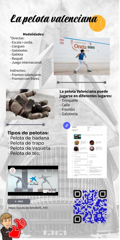 La pelota Valenciana puede jugarse en diferentes lugares: - Trinquete - Calle - Frontón - Galotxeta