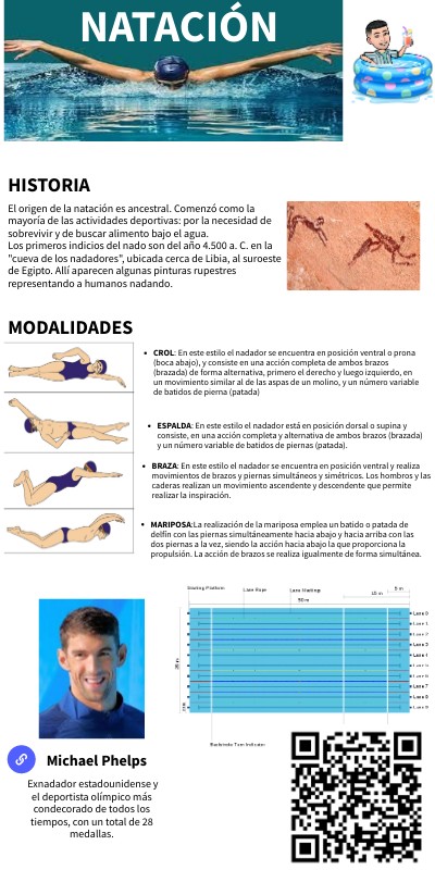 - ESPALDA: En este estilo el nadador está en posición dorsal o supina y consiste, en una acción completa y alternativa de ambos brazos (brazada) y un número variable de batidos de piernas (patada).