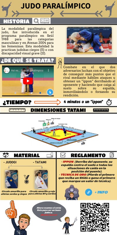 La modalidad paralímpica del judo, fue introducida en el programa paralímpico en Seúl 1988 para las categorías masculinas y en Atenas 2004 para las femeninas. Esta modalidad la practican judokas ciegos (J1) o con discapacidad visual grave (J2).