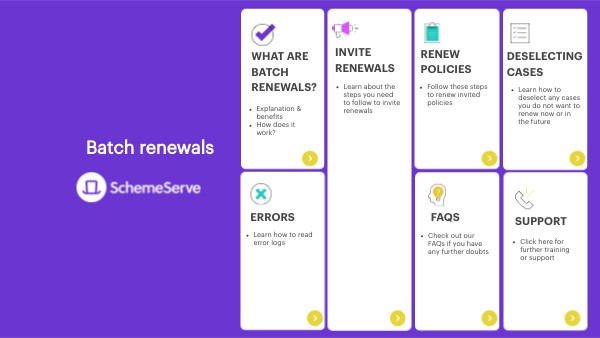 - Batch renewals refers to the process of renewing a large group or batch of renewals within SchemeServe. Renew policies for all customers who are due in a particular month in a single batch process.