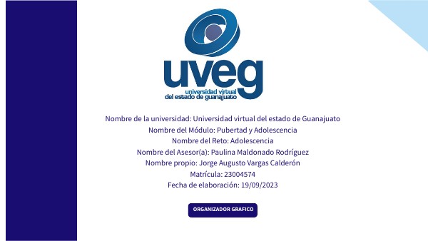 Nombre de la universidad: Universidad virtual del estado de Guanajuato Nombre del Módulo: Pubertad y Adolescencia Nombre del Reto: Adolescencia Nombre del Asesor(a): Paulina Maldonado Rodríguez Nombre propio: Jorge Augusto Vargas Calderón Matrícula: 23004574 Fecha de elaboración: 19/09/2023